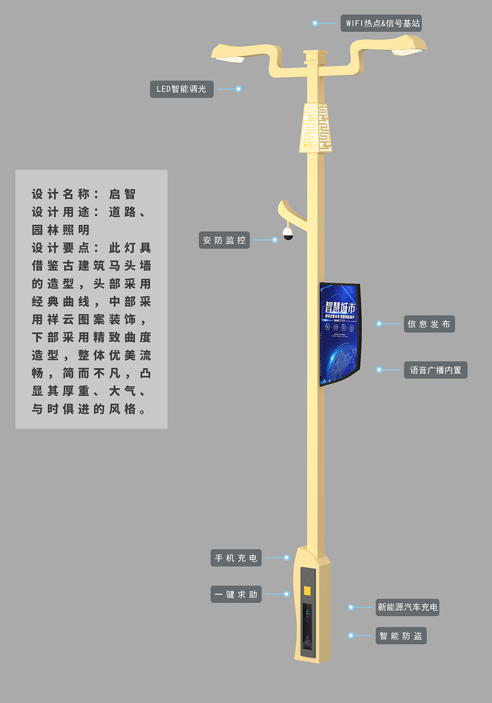設(shè)計(jì)要點(diǎn):此燈具借鑒古建筑馬頭墻的造型,頭部采用經(jīng)典曲線,中部采用祥云圖案裝飾,下部采用精致曲度造型,整體優(yōu)美流暢,簡而不凡,凸顯其厚重、大氣、與時(shí)俱進(jìn)的風(fēng)格。